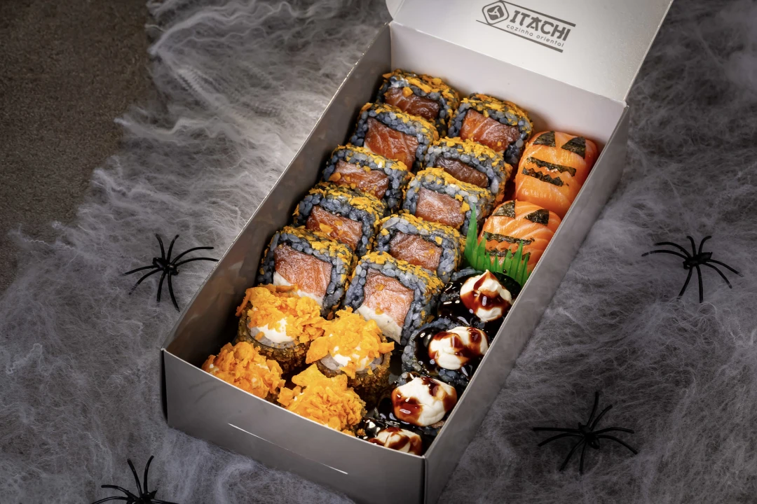 04 baterá com geleia de pimenta e raspas de limão, 04 uramaki kani, 04 uramaki skin, 04 uramaki salmão Philadelphia, 04 uramaki tomate seco e rúcula, 04 hossomaki tomate seco, 04 hossomaki skin, 04 hossomaki kani, 08 hot roll salmão.