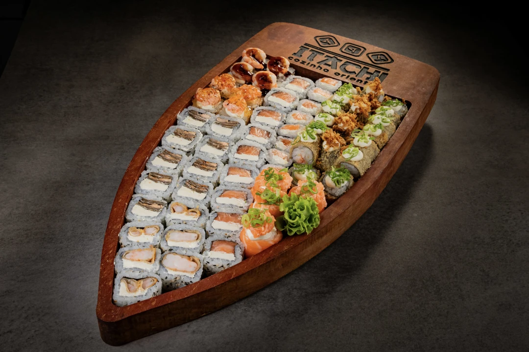 04 joy salmão, 04 baterá de salmão com geleia de pimenta, 04 baterá de camarão com molho de ostra, 09 uramaki salmão Philadelphia, 09 uramaki skin, 06 uramaki camarão empanado, 08 hossomaki salmão Philadelphia, 18 hot rolls.